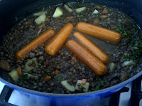 Eerst heb ik een ui klein gesneden en 2 grote knoflookteentjes geperst. Die gefruit in een eetlepel olijfolie en daarna een winterwortel in schijfjes en stukjes bijgevoegd. Na 5 minuten de linzen erbij gedaan met een laagje water erover. Hügliblokjes erbij en steeds kokend water bijgevoegd zodat de linzen net onder water blijven. Verder nog 4 blaadjes laurier, verse tijm uit de tuin en 2 kruidnagels en maar laten pruttelen.